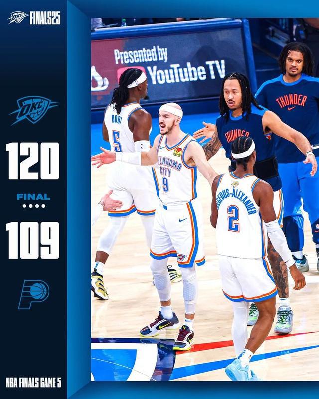 北京时间6月17日,NBA总决赛G5,雷霆坐镇主场迎战步行者,目前双方大比分战成2-2平手。最终,全场打完,雷霆120-109击败步行者,将系列赛总比分改写为3-2,顺利拿到冠军点。